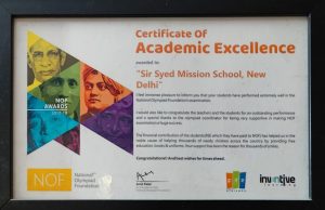 It was a proud moment for Sir Syed Mission School when it’s students achieved 1st & 2nd ranks in the state in Olympiad International Qualifier examinations conducted by NOF (National Olympiad Foundation). NOF constitutes docking of academic talent and social entrepreneurship helping the talent to come out from the walls of classroom. NOF conducts one of its own GLOBAL talent search exam where the resources are utilized for children in need who are ignorant about education.