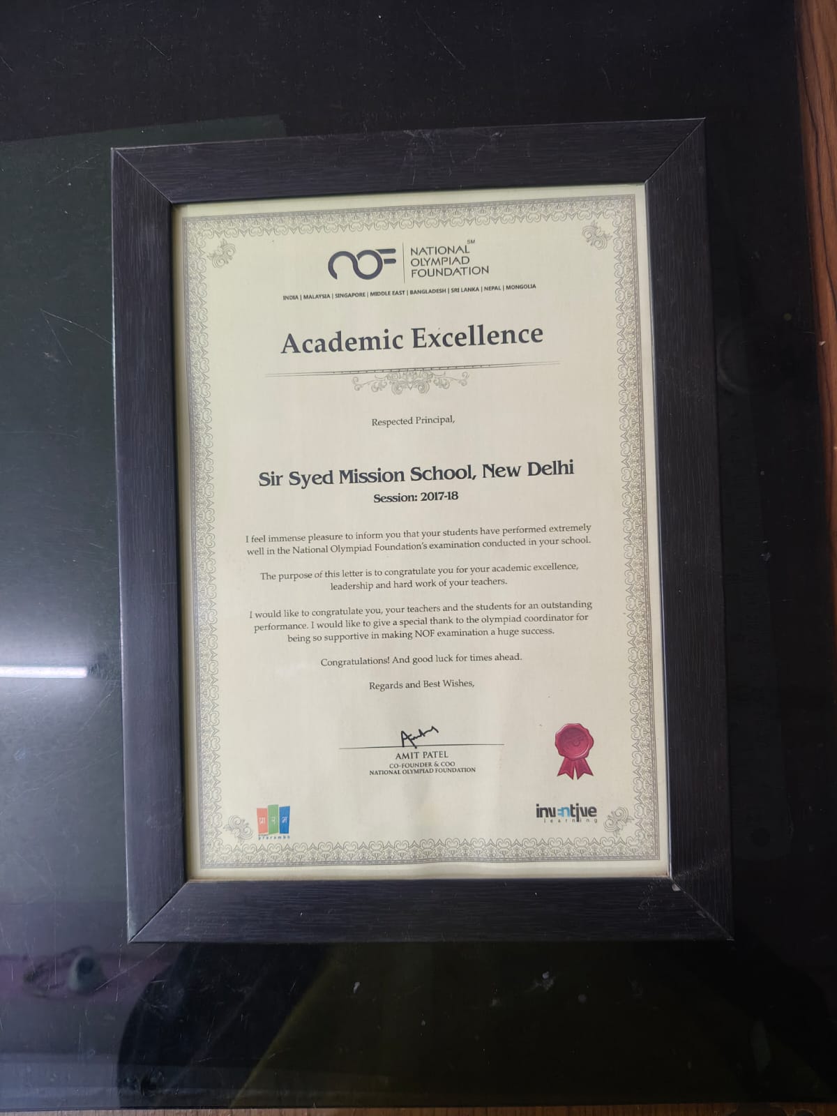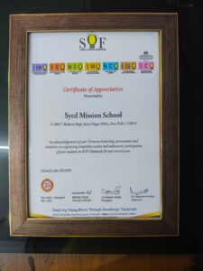 It was a proud moment for Sir Syed Mission School when it’s students achieved 1st & 2nd ranks in the state in Olympiad International Qualifier examinations conducted by NOF (National Olympiad Foundation). NOF constitutes docking of academic talent and social entrepreneurship helping the talent to come out from the walls of classroom. NOF conducts one of its own GLOBAL talent search exam where the resources are utilized for children in need who are ignorant about education.
